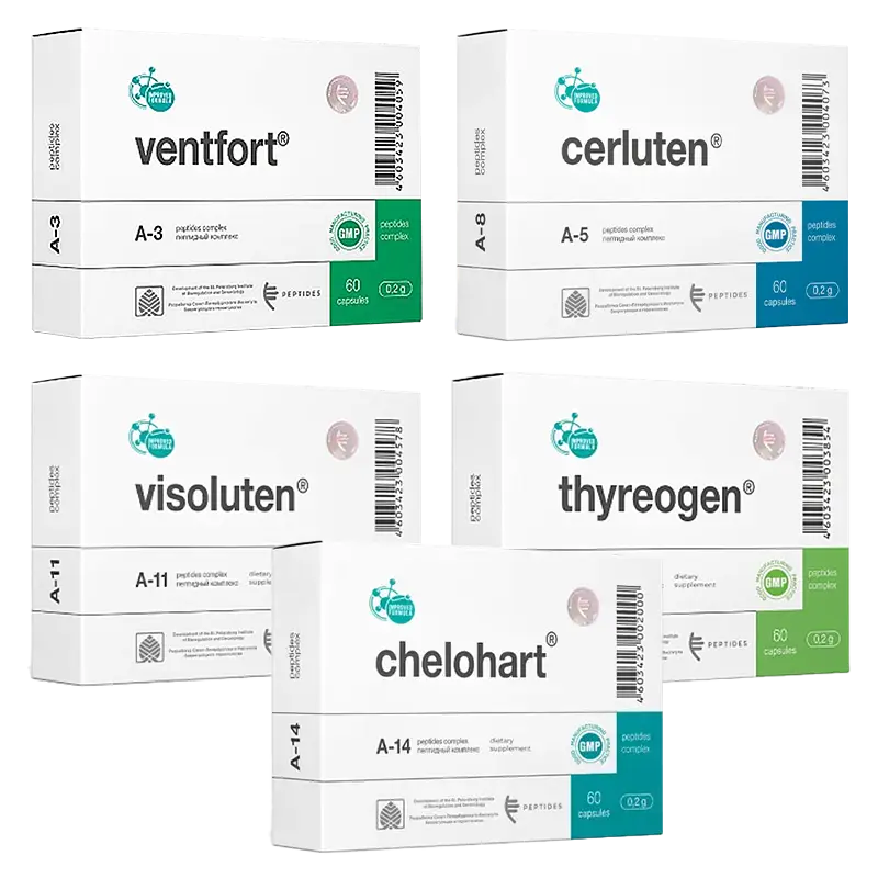 These five bioregulators work synergistically to slow aging, improve cellular function, and optimize longevity, focusing on the vascular system, brain, eyes, thyroid, and heart.